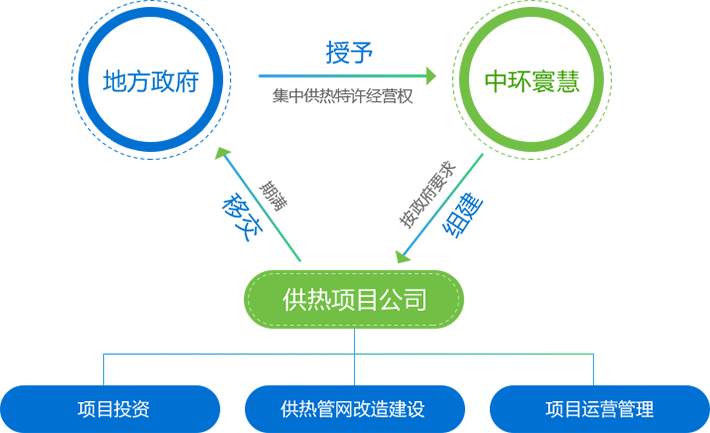 由地方政府授予集中供熱特許經(jīng)營權(quán),按政府要求組建供熱項(xiàng)目公司,承擔(dān)全部熱網(wǎng)改造、建設(shè)及項(xiàng)目運(yùn)營管理工作。